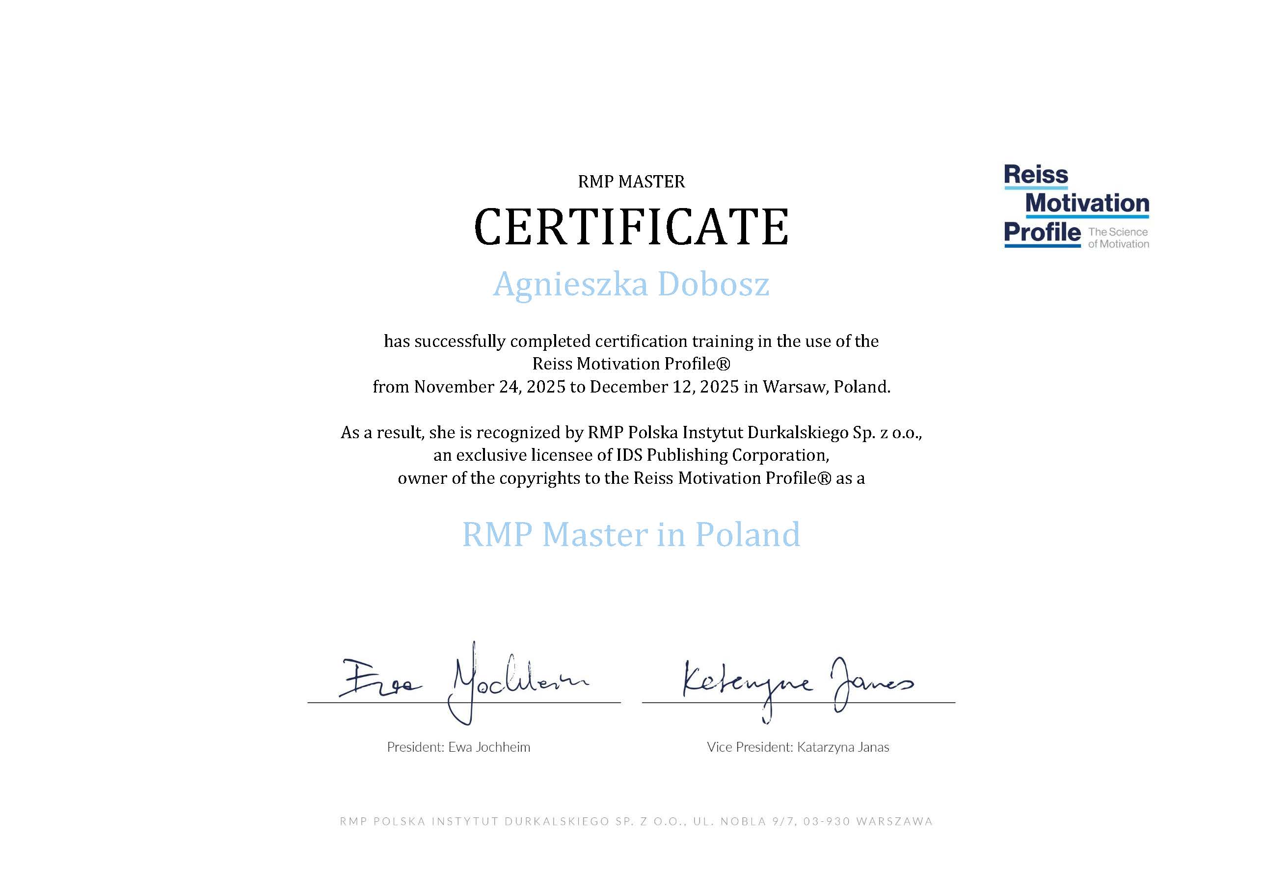 Dodatkowo, jako certyfikowana RMP Master in Poland, pracuję zgodnie z Kodeksem etycznym RMP Mastera, który precyzyjnie określa standardy odpowiedzialnej i bezpiecznej pracy z narzędziem Reiss Motivation Profile®. Kodeks ten kładzie szczególny nacisk na dobro osoby badanej, poufność, rzetelność interpretacji oraz świadome i etyczne korzystanie z wiedzy wynikającej z profilu motywacyjnego. Obejmuje także odpowiedzialność za sposób prowadzenia sesji informacji zwrotnej, właściwe kontraktowanie współpracy, dbałość o jakość usług oraz ciągły rozwój kompetencji osoby pracującej z metodą. Traktuję te zasady jako naturalne uzupełnienie mojej pracy mentoringowej i rozwojowej, ponieważ RMP to nie tylko narzędzie diagnostyczne, lecz przede wszystkim praca z człowiekiem i jego wewnętrznym światem motywacji.
